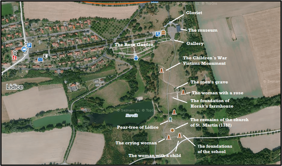 The Lidice Memorial is also easily reachable by the car. You need to take either the Evropská or Bělohorská street to get out of Prague and than take the highway D7. You need to exit the highway at the exit “7 Kladno, Lidice, Buštěhrad”. There is a parking lot right next to the alley of trees leading to Gloriet. The journey takes approximately 30 minutes (from the Prague city center) – the map is available here.