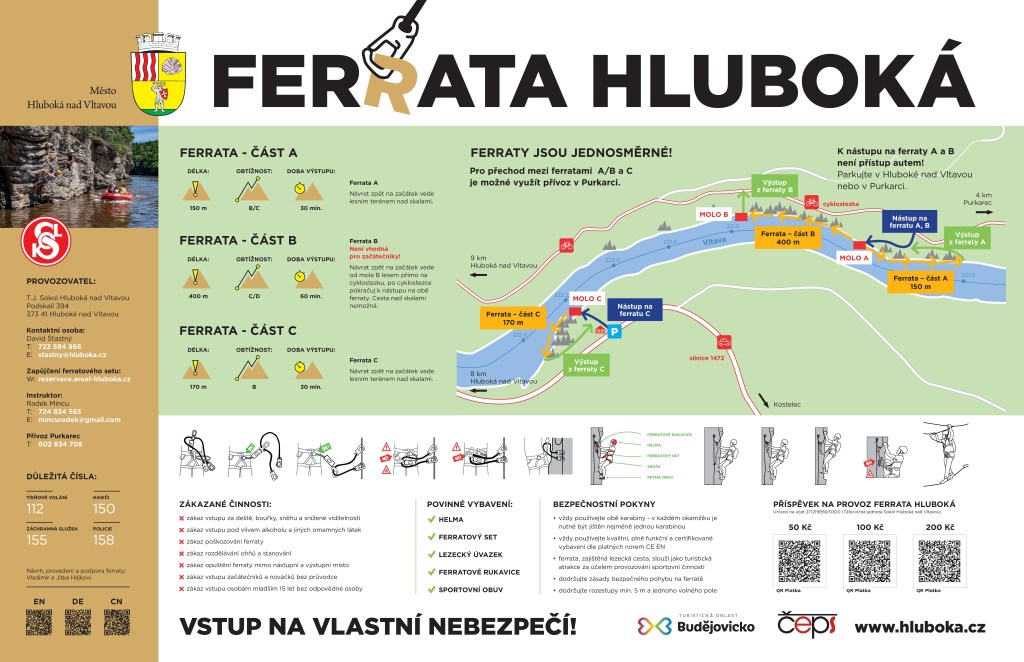 In total, Ferrata Hluboká has 720 meters of horizontal climbing and tens of meters of vertical climbing. It is the longest Czech via ferrata above the river. Ferrata Hluboká offers its visitors three routes/parts: